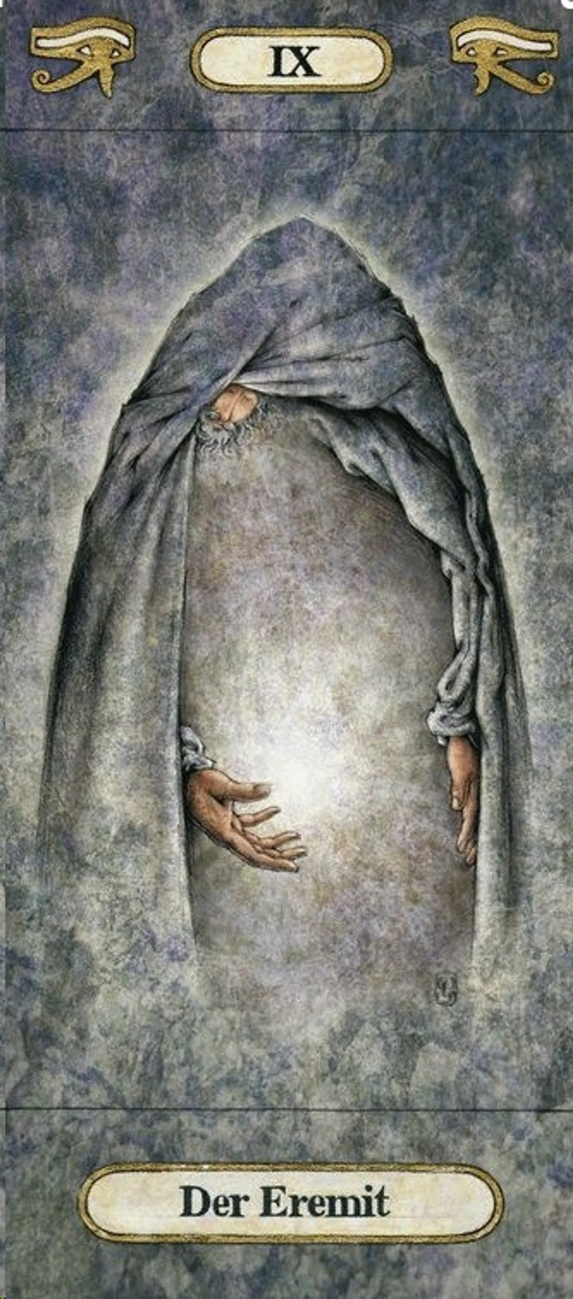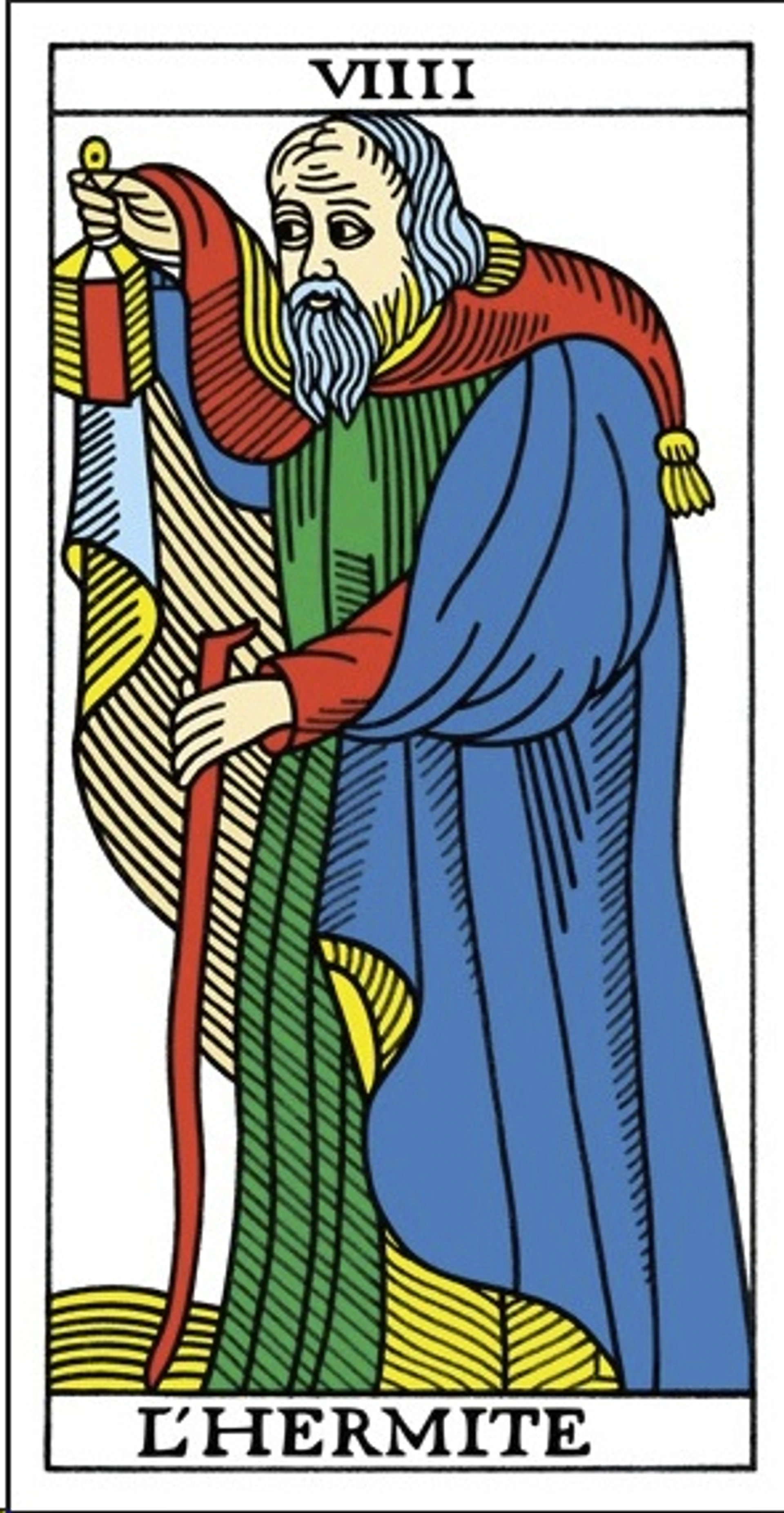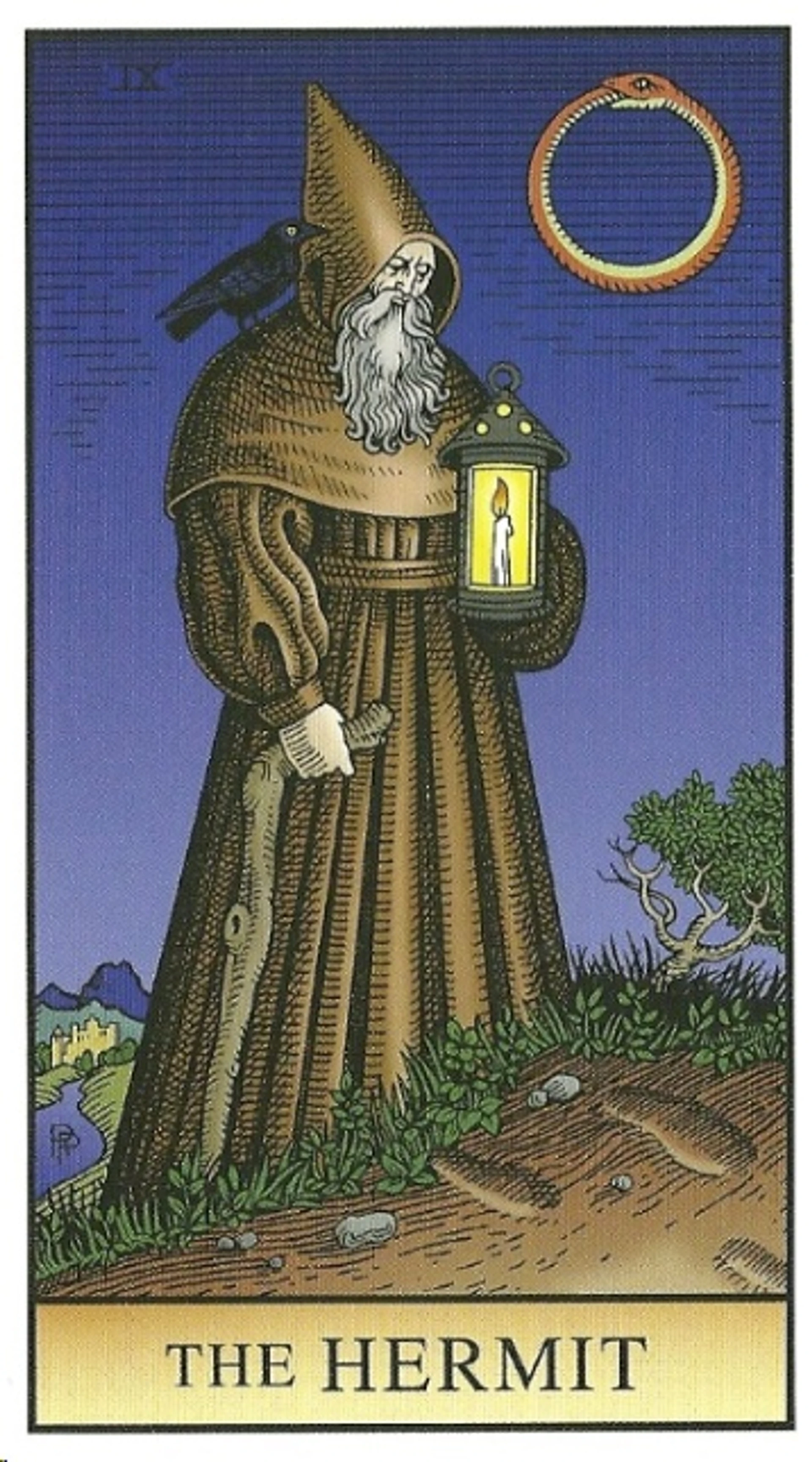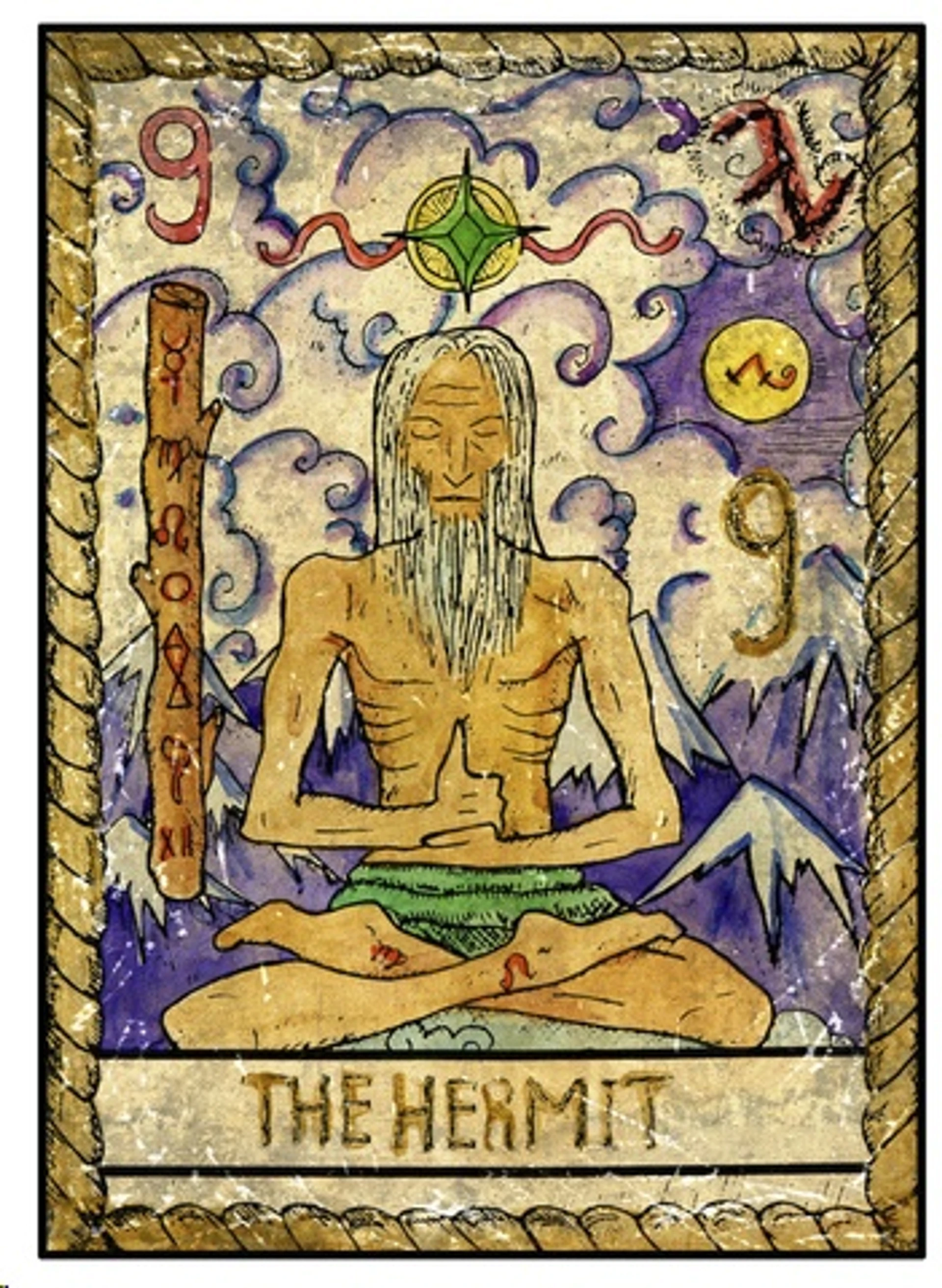As an archetype, the Hermit is someone who's already journeyed this path of inner order. This card embodies tranquility and inner peace – the state of a philosopher or guru who has grasped life by delving within, much like Henry David Thoreau or Siddhartha. The image of the Hermit is easily recognized across various cultures' mythologies: a solitary figure in a cloak, living in the woods, atop a mountain, or in a house at the edge of a village; a wise man to whom the hero comes for advice, for a kernel of wisdom that will aid them on their journey.
