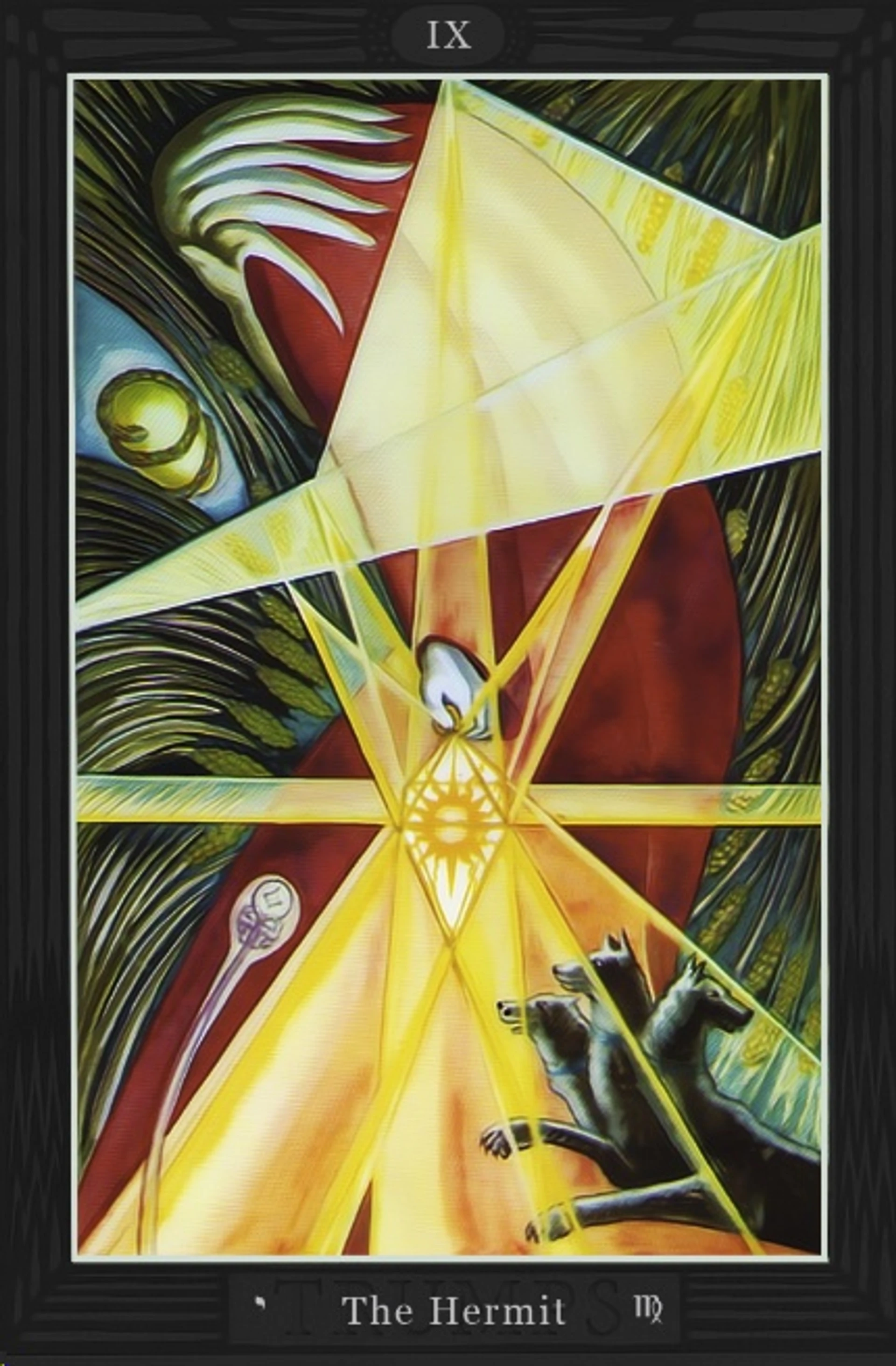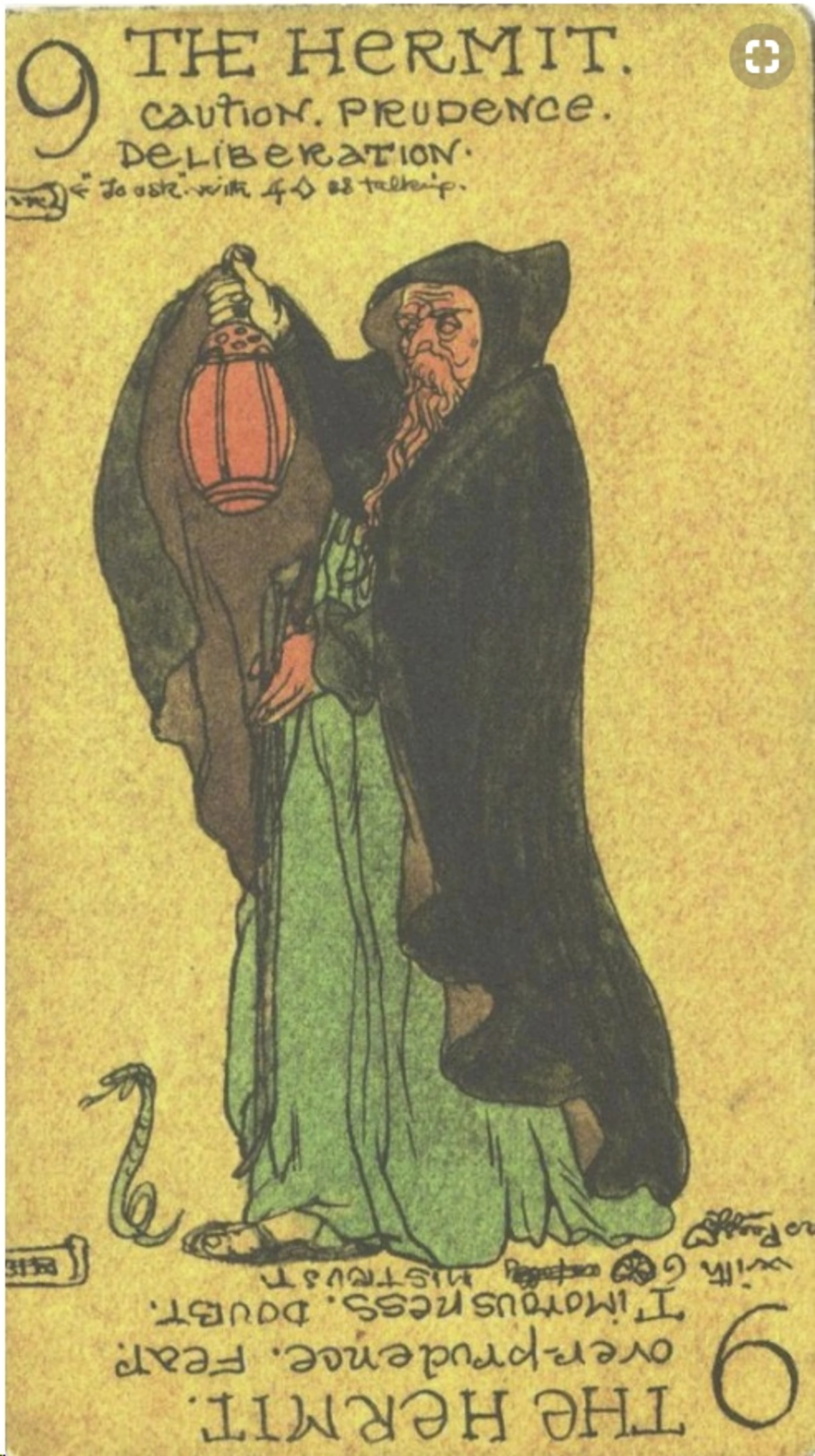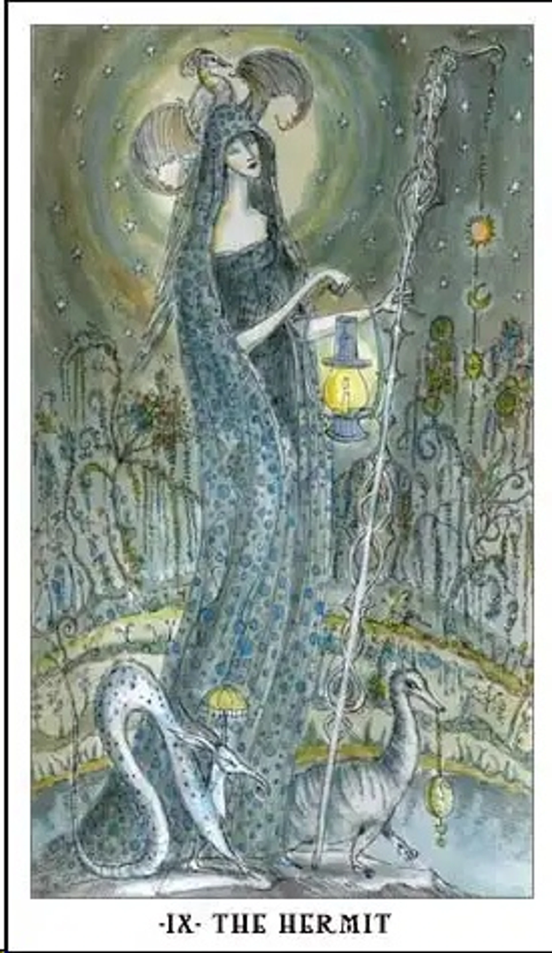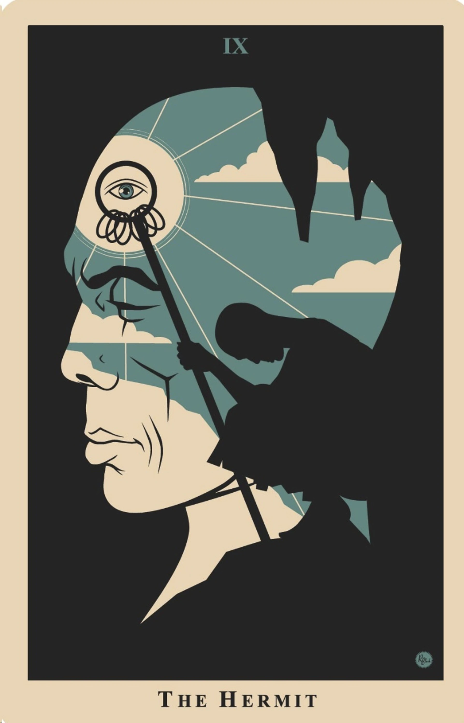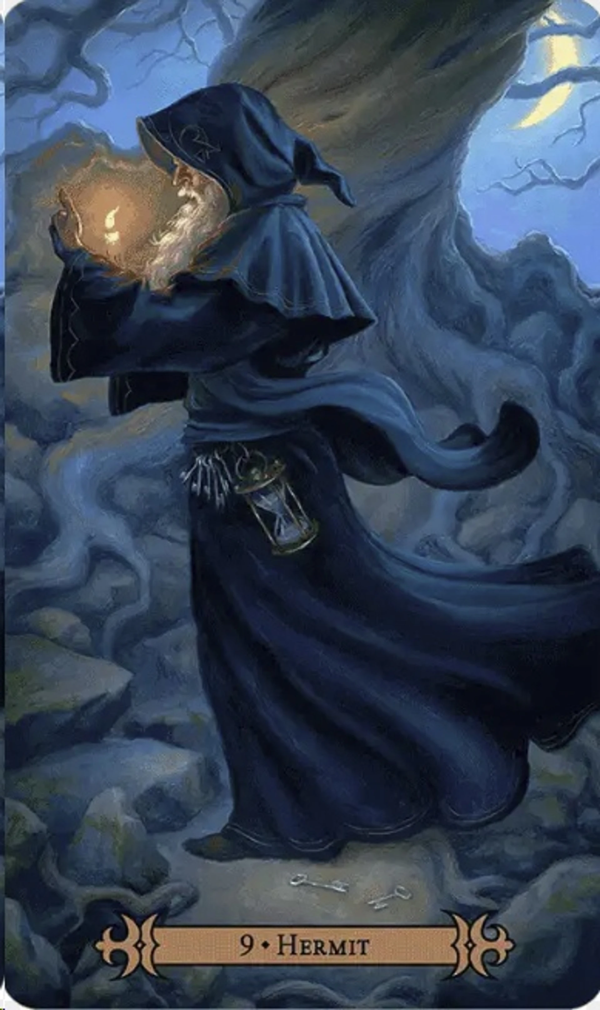 As an archetype, the Hermit is someone who's already journeyed this path of inner order. This card embodies tranquility and inner peace – the state of a philosopher or guru who has grasped life by delving within, much like Henry David Thoreau or Siddhartha. The image of the Hermit is easily recognized across various cultures' mythologies: a solitary figure in a cloak, living in the woods, atop a mountain, or in a house at the edge of a village; a wise man to whom the hero comes for advice, for a kernel of wisdom that will aid them on their journey.
